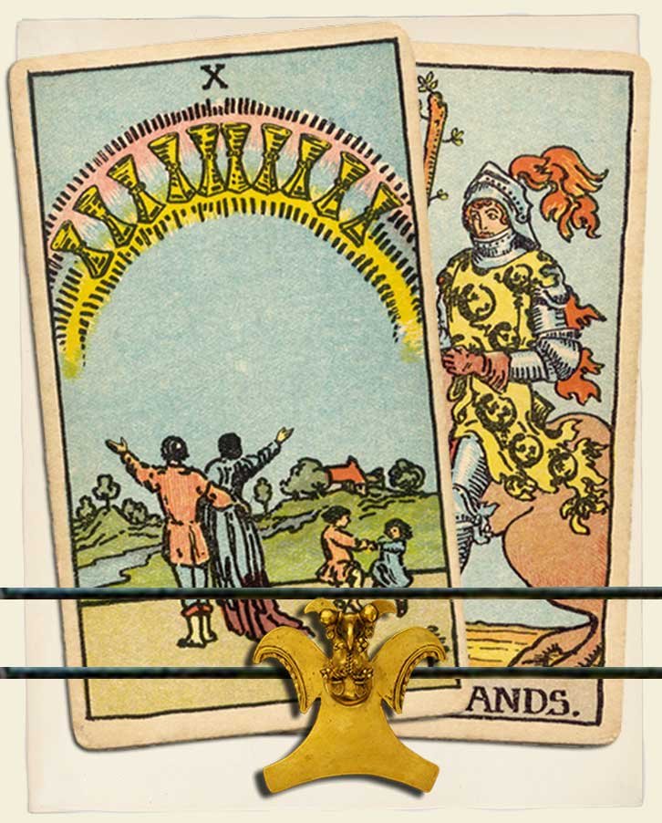 Ten of cups and Knight of wands combination indicates that two tarot influences: 1) EMOTIONAL STABILITY and 2) INSPIRED ACTION are influencing you at the moment. What’s the advice of this pair? The Ten of cups represents a high point in your emotional life, where everything is balanced and equal. This stability can create an energy of stasis that may lead to feelings of complacency or even stagnation. The presence of the Knight of wands indicates that you need to be more adventurous with how you approach things emotionally. This often involves some risk, as indicated by the Wands card itself (a spark). Be sure not to burn any bridges along the way though, because when this knight visits, he always leaves something behind for others to build on later.