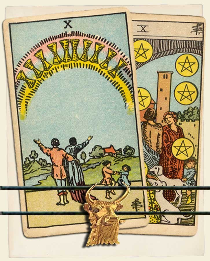 Ten of cups and Ten of pentacles combination gives a hint about an important development in your future. It is influenced by the arcane tarot forces of (A) HOMECOMINGS and (B) ANCESTRY. You’ve felt so alone recently, like no one understands you or even knows your name. Still, these cards say that will soon come to an end: you will meet someone whose origins spring from the same source as yours. How many times have your paths crossed in the city without either of you knowing? Well, now, at last, you have found each other. So, take the risk and reach out: it will be like coming home after a long time abroad.