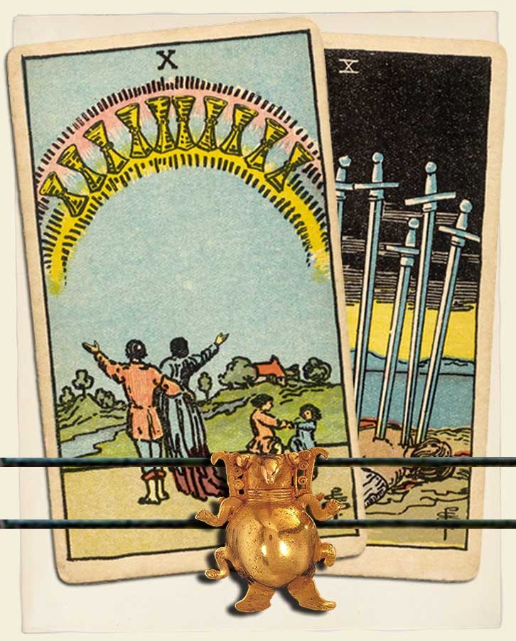 Ten of cups and Ten of swords combination gives a glimpse into your distant and barely discernible future. It is influenced by the arcane forces of (A) SECURITY and (B) RUIN, and at times like these, it is a good thing you have your closest friends and family there to support you. Something has ended. It was a difficult situation, and it needed to end. Still, you are not feeling too good about that, but the people closest to you are here to help. Whatever you need, you’ve got it. If you need a friend to sit up with you all night, just ask. If you need a coworker to pitch in, one will be there because the security of the ten is about supporting you.
