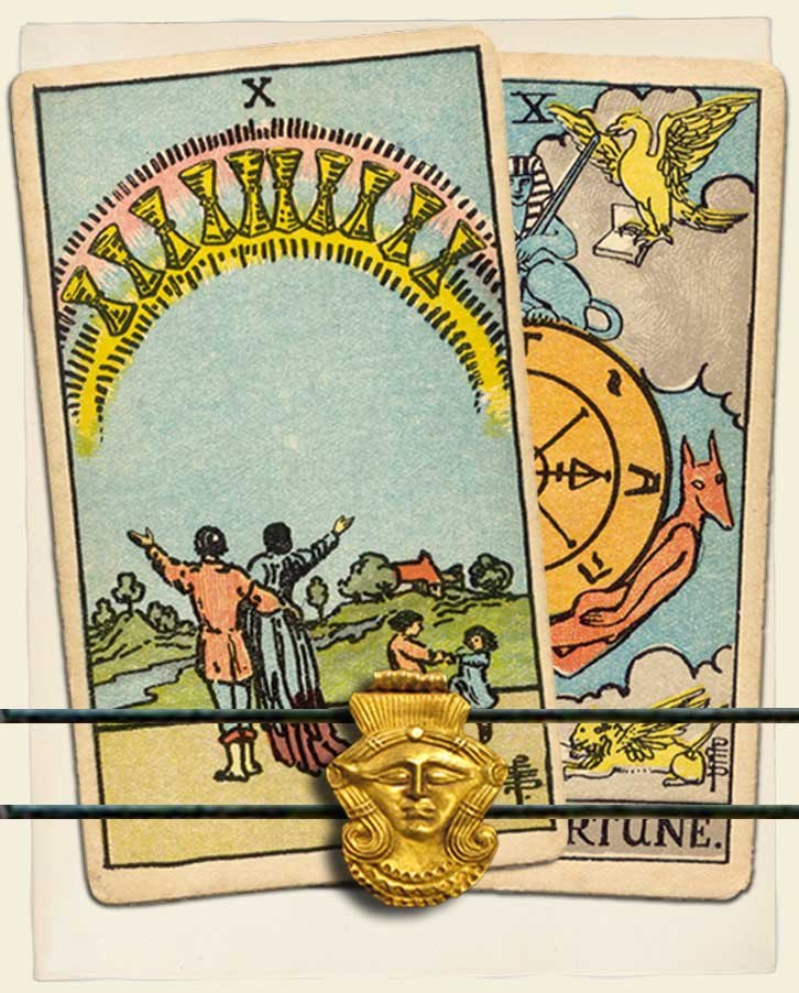 The combination of Ten of cups and Wheel of Fortune is influenced by two arcane forces: happiness and life cycles. This means that as long as you honor your need for emotional fulfillment, the universe will reward you with continual satisfaction in all aspects of life, including love.