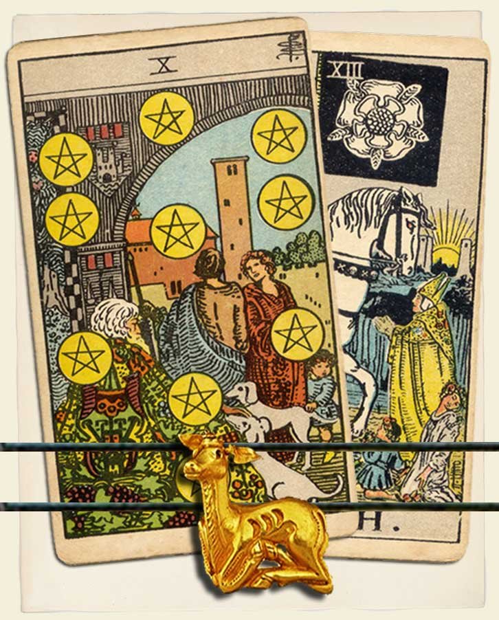 Ten of pentacles and Death together means that mystic tarot forces: A) Ancestry (Ten of pentacles) and B) Transformation (Death) currently guide your decisions. In other words, it means that your family life is undergoing a major change. What’s the advice of this pair? The Ten of pentacles indicates that there is something very stable and abundant in your life that is connected to family. Your legacy and its future are being affected by the energy of profound change brought by the Death card. Death in the Tarot represents metamorphosis – the end of one stage of life to begin a new one. Something or someone “dies” and is reborn. Here, that seems to apply to whatever the Ten of pentacles represents to you. This transformation will have a deep impact on your family life, so, while it’s necessary, prepare for unpleasant reverberations.