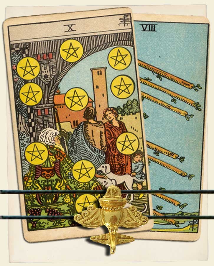 Ten of pentacles and Eight of wands combination indicates that tarot influences: (1) Ancestry and (2) Air Travel (influence of Eight of wands) are jointly exerting their influence on your life’s choices. What does it mean? In a nutshell, you’re going back home to visit family or perhaps meet new people in your community who have something important to share with you. You may be taking an interest in local affairs or maybe just getting together with friends and having fun. Whatever the case, this is a good time for socializing as long as you keep an open mind about what others have to teach you.