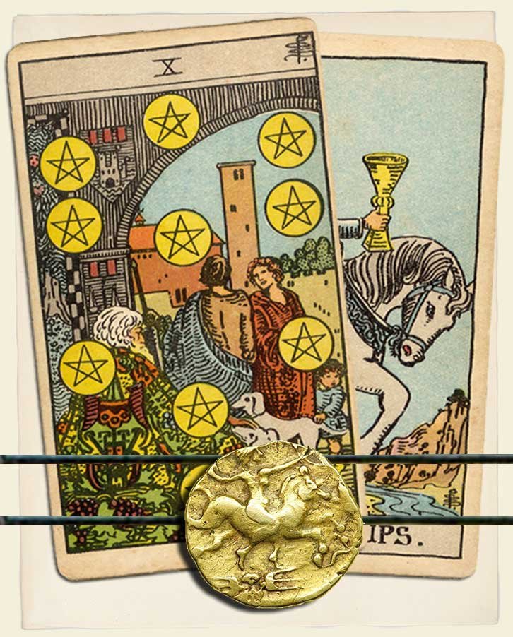 Ten of Pentacles and Knight of Cups combo interpretation
