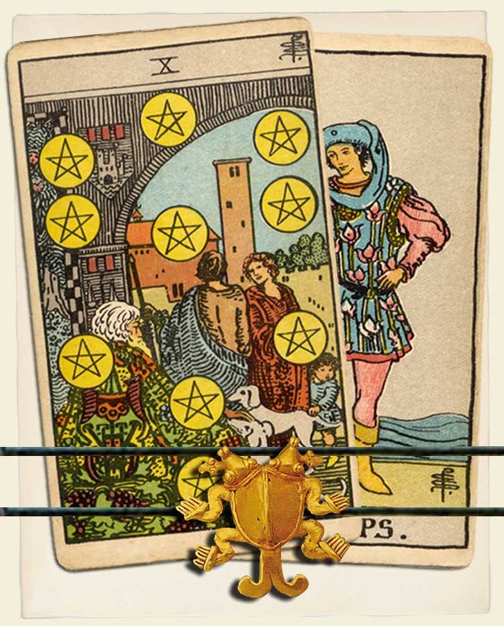 The combination of the Ten of Pentacles and Page of Cups is a very good sign for love and relationships. It provides insight into a major event in your future, which will come to pass from the combined effect of inheritance and intuitive messages.