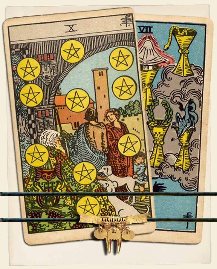The Ten of pentacles and Seven of cups combination in love and relationships is a mix of positive and negative energies. The influence of the Ten of Pentacles is very positive as it represents inheritance, family generations, longevity investments, and ancestry. It signifies coming home to all your most beloved obligations which makes relationships more solid with a loving group vibe. However, the Seven of Cups has a somewhat bad influence on love with confusion reigning supreme. This energy often feels like there is fog obscuring your choices making indecision worse leading to feelings of insecurity.