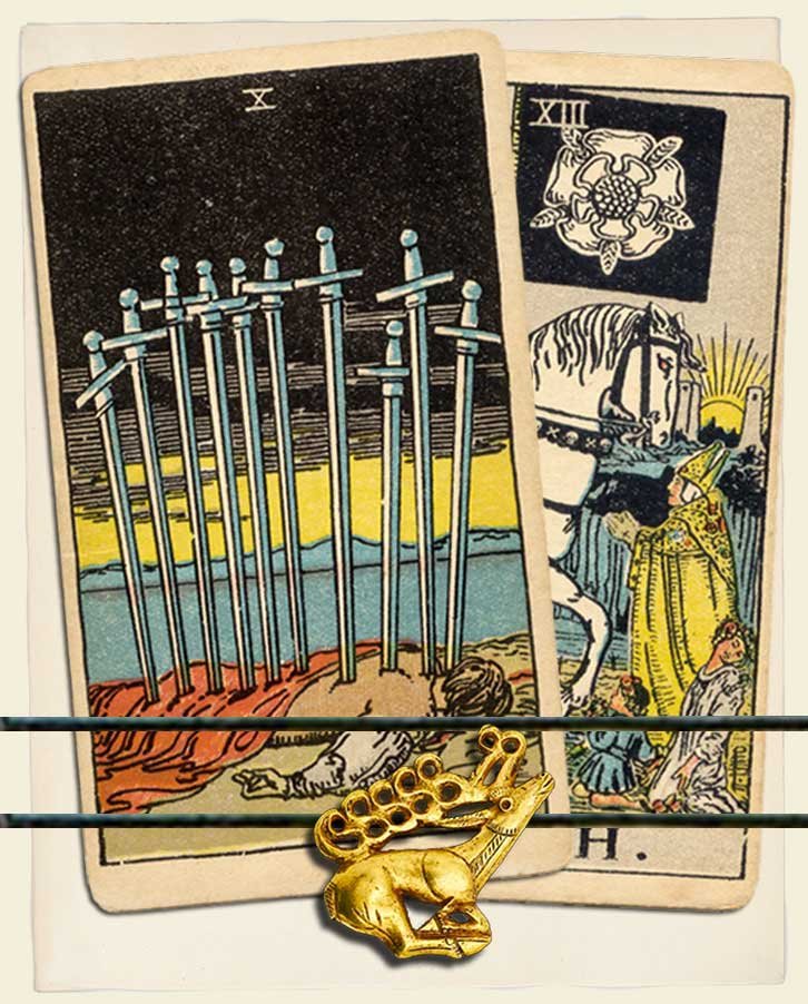 Ten of swords and Death combination gives an insight into an event in your future. It is influenced by the tarot forces of (I) BETRAYAL (from Ten of swords) and (II) ENDINGS (from Death). This ending was not what you expected, but it is for the best. You may have been carrying around a lot of hurt feelings that were getting in the way of moving forward, but now you can let go. The past is dead and gone, there is no sense dwelling on it any longer. Look to the future where new opportunities await as indicated by the Ten of Swords which represents a painful end to something important in your life. Let this be your warning: Don’t hold on so tightly that you choke yourself with regret when this ends.