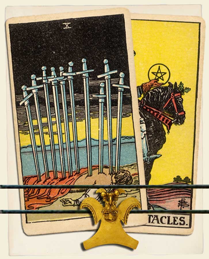 Ten of swords and Knight of pentacles combo means that arcane tarot forces: 1) painful endings and 2) stoic govern your life decisions today. In essence, you will need to remain strong in the coming months. The floor has vanished beneath you and now you are in free-fall. Still, these cards suggest, it’s largely up to you how to respond. You can flap your arms frantically– or take another route. Think of it this way: Acceptance is a great source of buoyancy. So, get accepting: Allow it to break your fall.