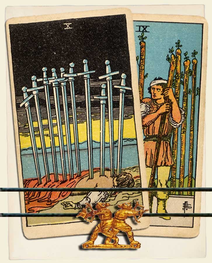 Ten of swords and Nine of wands tarot combination means that two mystic forces: 1) Collapse (from the side of Ten of swords) and 2) Boundaries (from the side of Nine of wands) guide your life decisions today. To put it differently, it gives you a sign that the powers that be wish for you to hold steady despite what has been a devastating setback. Most people in your circumstances would fold under the weight of disappointment, but you are encouraged not to give up. There is a light at the end of every dark time, and this one is no exception to that rule. Failure is an integral part of the process that is success.
