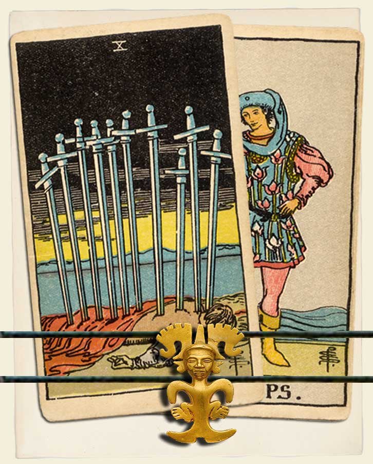 Ten of swords and Page of cups combination gives you intuition about your current state and immediate future. It is influenced by the tarot forces of (I) Painful Endings (from Ten of swords) and (II) Possibility. Did you recently go through a breakup, got fired, or simply don’t know where you’re heading? Yes, I’m aware you’re facing some difficult times, but where’s your optimism? While the Ten of swords recognizes your pain, the Page of cups suggests that there is hope and possibility on the horizon. Things may not be easy right now, but try to hold on to the hope that things will eventually get better. In the meantime, take care of yourself and reach out to your loved ones for support.