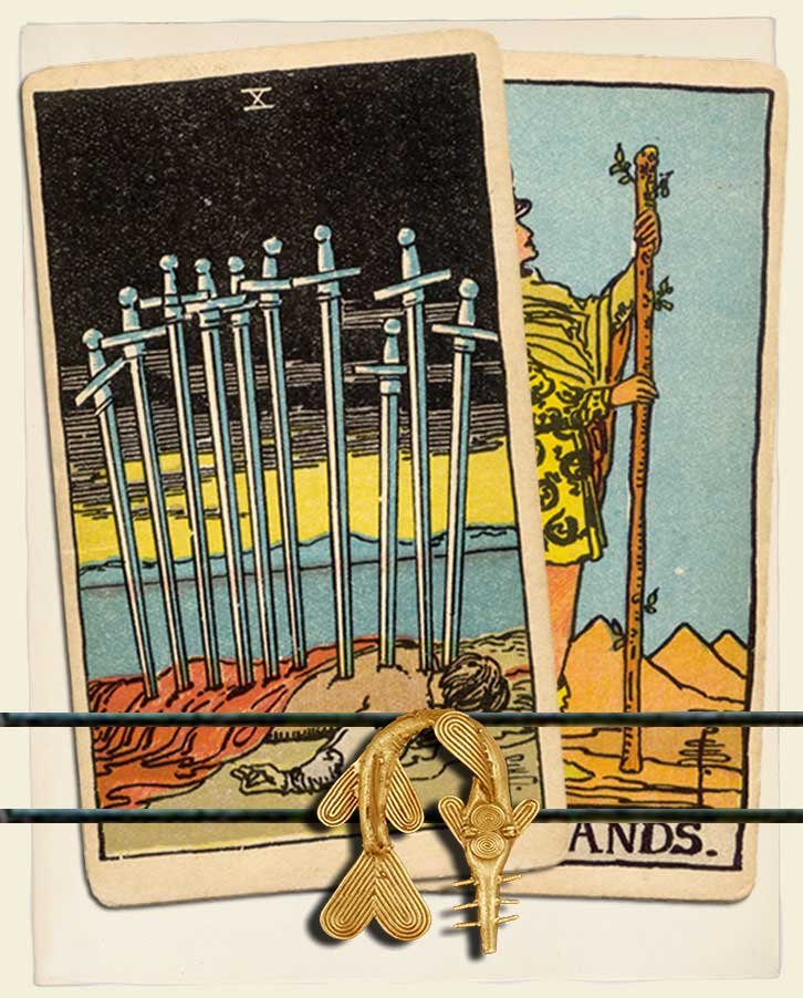 Ten of swords and Page of wands tarot combination means that two tarot influences: 1) Failure and 2) Free Spirit are affecting you today. You seem to be a bit demoralized by one negative experience after another in your work. You’ve thought a lot about why you can’t do it. Your thoughts are right. You should learn a lesson from this. You will succeed in your next attempt, just don’t stop trying. Do not forget this, one bad event is better than a thousand pieces of advice.
