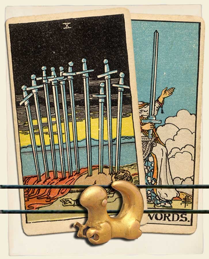 Ten of swords and Queen of swords combination indicates that two tarot influences: 1) Loss and 2) independence drive your choices at this moment. This can be a frightening pair to draw. The key word to understanding this pair is “resurrection.” The Ten of Swords indicates a deep loss, depicting a person with ten swords stuck in their back. Someone has betrayed them. However, the Queen of Swords reminds us that we are everything we need to accomplish our hearts’ desires. The Queen has removed all the swords from her back and saved one for herself. Painful experience can make us grow wiser, but take only what you need from it.
