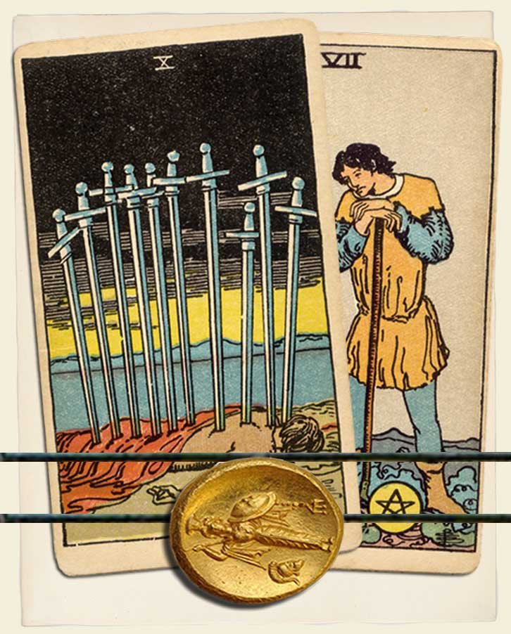 Oh, dear. This combination of the Ten of Swords and Seven of Pentacles is not a good sign for love and relationships. It means that you are going through a tough time after experiencing a painful betrayal that has left you feeling bitter and limited in your energy.