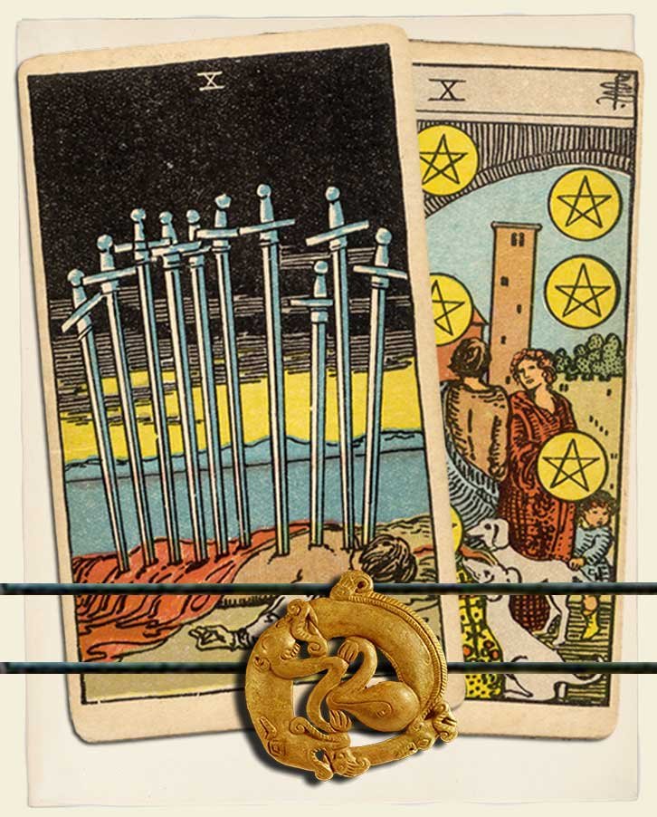 Ten of swords and Ten of pentacles combination gives an insight into an event in your future, which is influenced by the tarot forces of (I) CRISIS (from Ten of swords) and (II) WEALTH (from Ten of pentacles). What’s the advice of this pair? The Ten of Swords represents a high degree of distress that often stems from a betrayal. In this energy, people are at their most vulnerable. This can create a sense that things will never be the same again. It may seem as if everyone you know has turned against you. If so, it’s important to remember that this isn’t real – only your mind thinks it is. The presence or absence of wealth doesn’t change anything on its own, but when combined with the tenacity required to navigate through these difficult times, it does indicate something valuable might come to light for you.