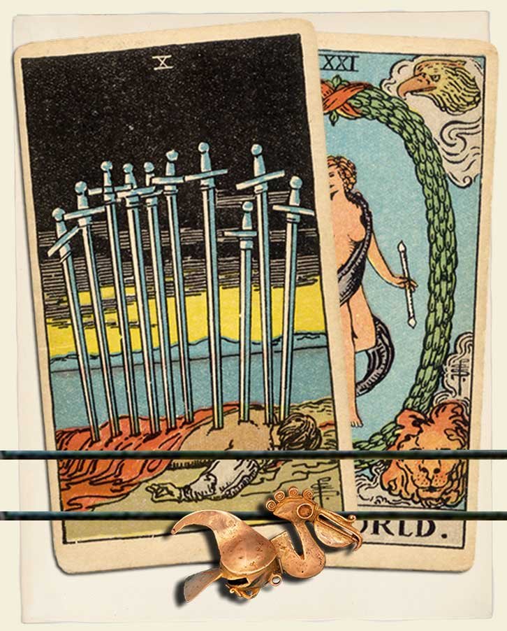 Ten of swords and The World combination gives a sign that two tarot influences: 1) Deep Wounds and 2) Travel have influence on you today. It is hard to walk away from situations when the Ten of Swords appears, because it indicates that there are serious problems in your life. There may be arguments or even fights going on right now, but they will not get better with time. This situation has gone too far for any kind of compromise or settlement to make sense at this point. You need to take action before things go further out-of-control, so do what needs doing and move on.