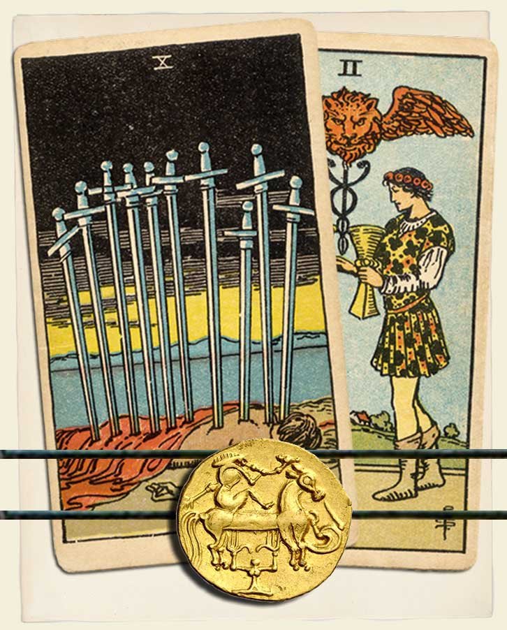 Ten of swords and Two of cups together indicates that two arcane forces: 1) Loss and 2) Connection are affecting your life path at this reading. Whilst you may be experiencing loss, you are feeling the effect of their presence even after they passed. It’s in the whistling of the wind and the rustling of the leaves, or the birds that sing you awake each morning and the sun that sets each of your days like a comforting blanket of consistence are what connects you eternally to their spirit. Never let it go.