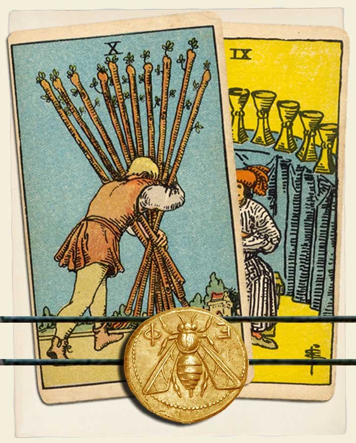 Ten of wands and Nine of cups combination gives you a better insight into a significant event in your future, which is directed by the guiding influences of (A) Duty and (B) Contentment (as per influence of Nine of cups). Ten of wands states a heavy workload and feeling crushed and pressured by the work. Nine of cups talks about positive changes, wishes coming true, a short-term happiness. Together they inform you that through hard work and dedication, you will achieve what your heart desires. Ten of wands in Rider Waite Tarot illustrates a man carrying ten heavy sticks on his back, seeming burdened and exhausted. However, as the last numerical card of the suit of wands, combined with the nine of cups, shows that you are at the end of this difficult journey and your troubles will soon be over.