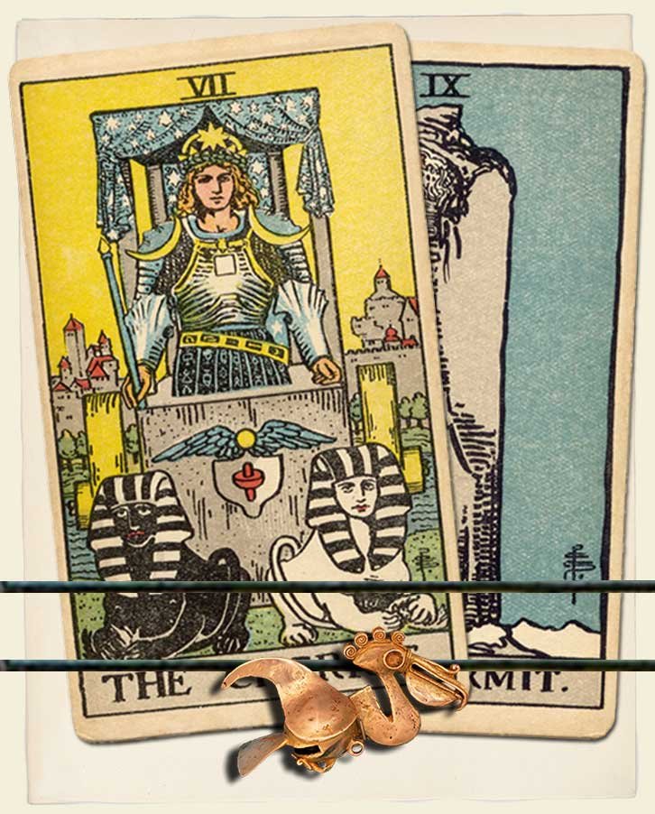 The Chariot clarified by The Hermit gives a glimpse into your near future, which is influenced by the tarot forces of (I) Determination (from The Chariot) and (II) Solitude (from The Hermit) and it is in the quiet moments that you will find the strength to handle that Chariot. Somewhere within you is the presence-of-mind and a determination to see an arduous task through to completion. You will need this, but first you must find it, and right now, you may be overwhelmed with the demands of friends, family, and coworkers, so what you need is to retreat for a moment. Don‘t worry. You will be back before you know it.