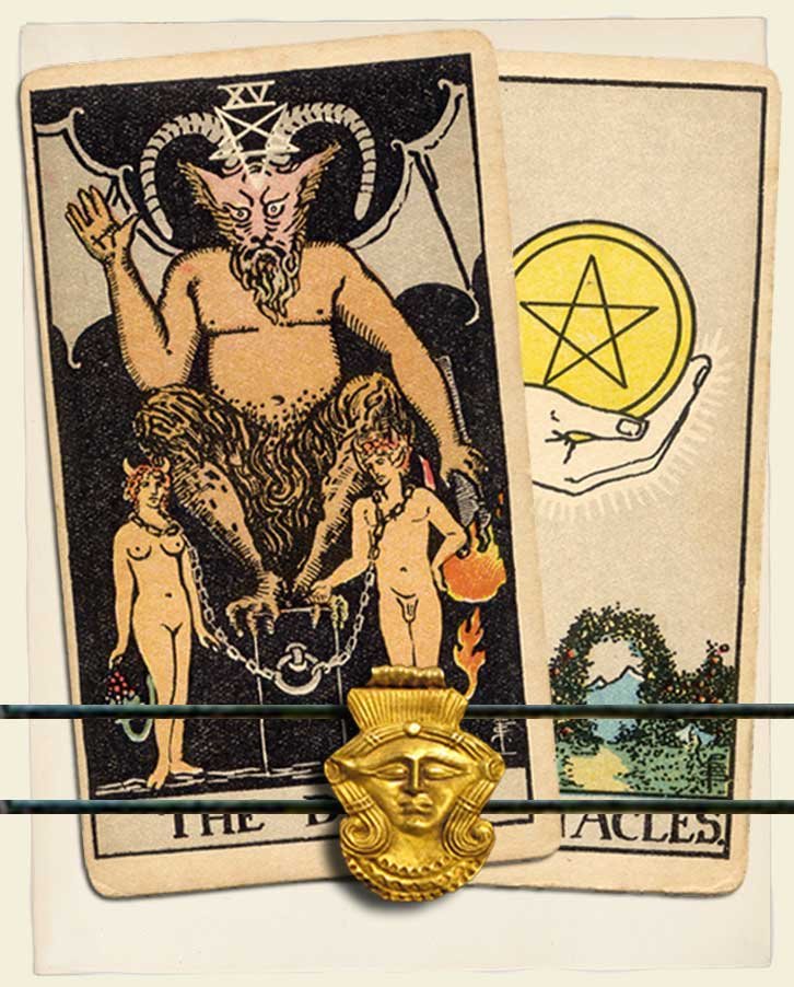 The Devil and Ace of pentacles combination provides an insight into an event in your future, which will come to pass from the combined effect of (1) SHADOW SELF (effect of The Devil) and (2) MANIFESTATION (effect of Ace of pentacles). How to interpret this tarot combination in practice? You may be feeling a bit shadowed by past events or circumstances that you have been unable to shake. It is time for new beginnings, though. The presence of the Devil indicates that there are some things holding you back. Perhaps it is fear or doubt, but whatever it is, face it head on with courage. The presence of the ace here indicates that if you can muster up any at all, anything is possible right now. Don’t let yourself get bogged down thinking about what might go wrong again because even if something does go wrong, it won’t matter much anymore once everything shakes out as planned.
