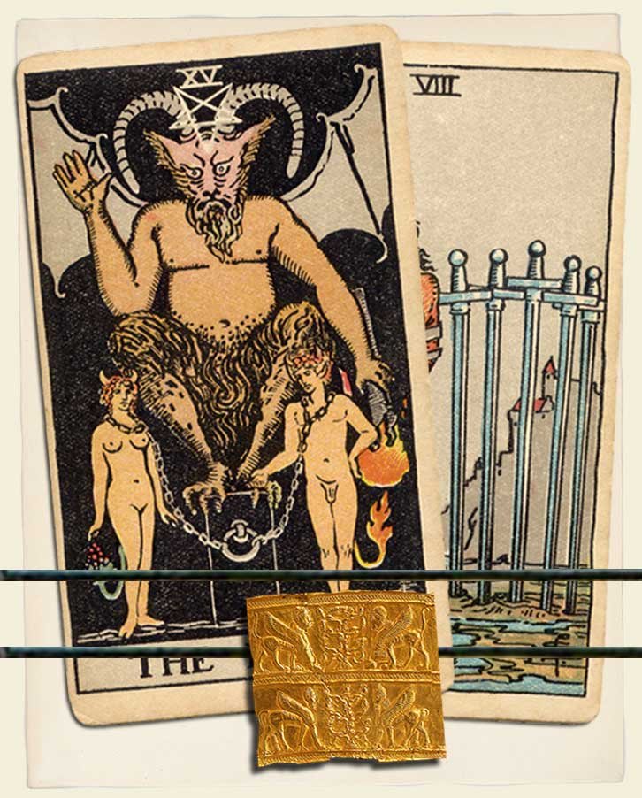 The Devil and Eight of swords tarot combination gives a hint about your immediate future, which is influenced by the arcane forces of (1) ATTACHMENT and (2) IMPRISONMENT. This combination may indicate that you have an addiction problem. This could both mean substance abuse, or behavioral addictions like gambling, shopping, etc. Additionally, it could also indicate that you are trapped in a toxic relationship, and you cannot escape. This combination reminds you that you are only as imprisoned as the limits of your own mind. Believing that you are capable of escaping is enough for you to understand you are already free.