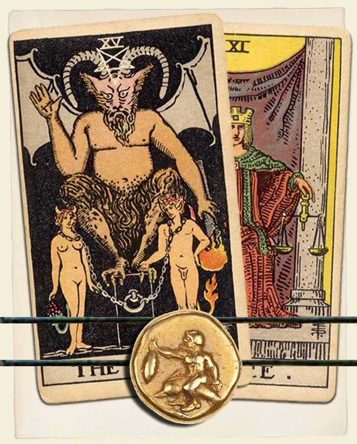 The Devil and Justice combination means that two mystic forces: 1) SEXUALITY and 2) JUSTICE have influence on you at this moment. In essence, you will soon be called on to make a moral choice. You’ve been tempted to act impulsively of late. True, you’re an adult and it is your choice. Just remember: the truth always has a way of rising to the surface. Don’t want to have to worry about that? Well, the solution is simple– just make sure you don’t have anything you need to keep submerged.