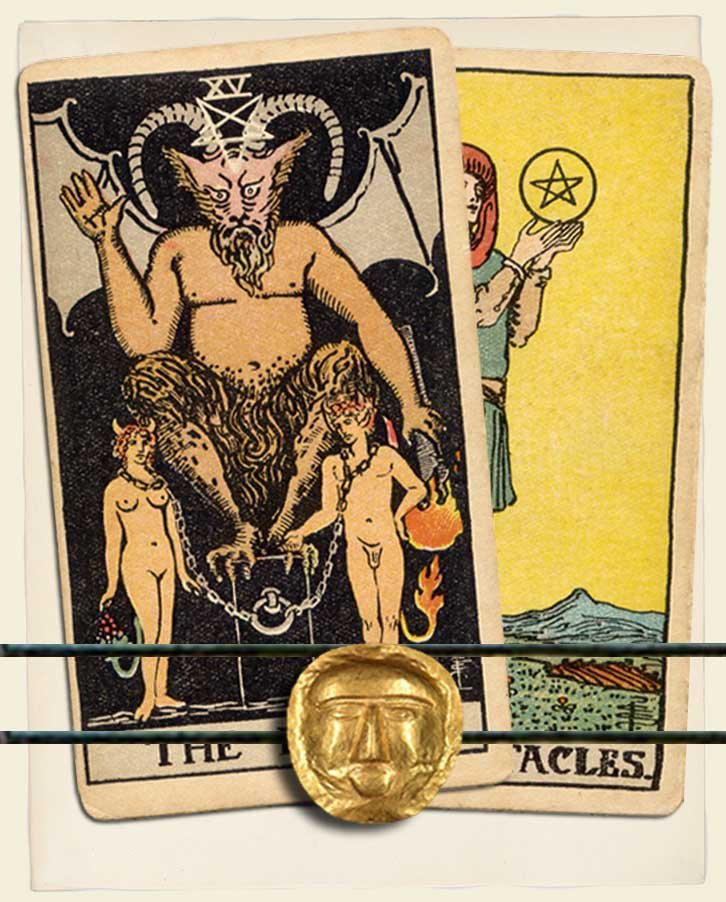 The Devil and Page of pentacles combination provides an insight into a significant event in your future, which is directed by the guiding influences of (1) SEXUALITY and (2) SKILL DEVELOPMENT (as clarified by Page of pentacles). To put it differently, it gives you a sign that by overcoming any unhealthy relationship with sex or your body, you will be able to create and maintain loyal relationships. The Devil in this context can represent an unhealthy obsession with pleasure or with your own body. Its partner the Page of Pentacles asks that you take the time to develop the skill of self-love before seeking it from others. Know that by doing this inner healing, you will easily attract stable & abundant relationships into your life.