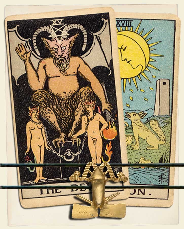When The Devil and The Moon appear together in a tarot reading, it is not a good sign for matters of the heart. It indicates that two powerful forces are guiding your decisions: your shadow self and fear. Your anxiety holds too much power over you, causing you to feel heavy and helpless. But this need not be so.
