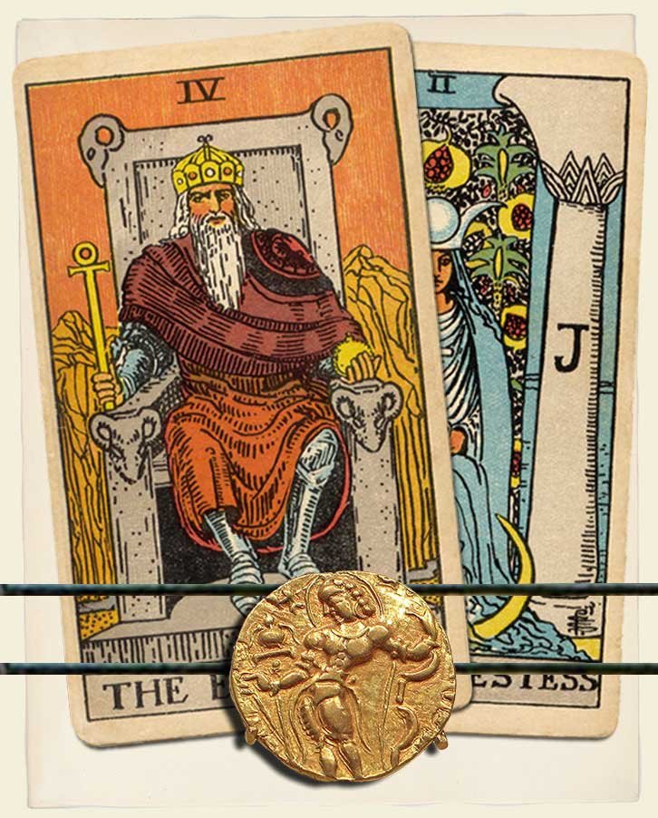 The Emperor and The High Priestess tarot combination provides an insight into your distant and barely discernible future, which is influenced by the arcane tarot forces of (A) A FATHER FIGURE and (B) UNCONSCIOUS. In essence you will soon find yourself liberated. Still, probably not how you think. In fact, it may come of something of a surprise. After all, the most insidious of our illusions are those we are completely unaware of. Confused? All will become clear in the coming weeks.