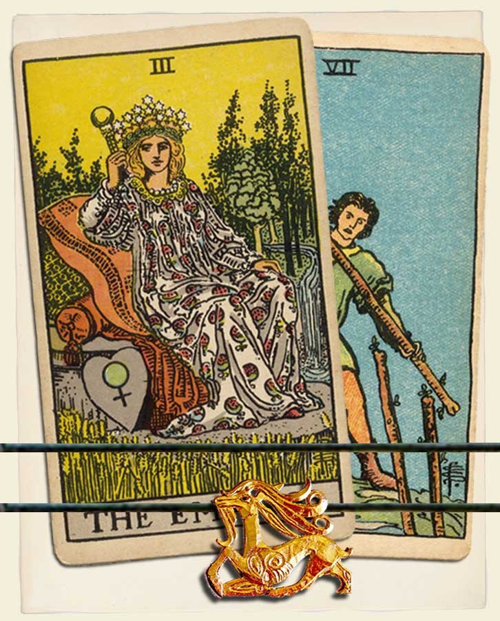 The Empress and Seven of wands combination means that two arcane forces: 1) Nature and 2) Competition are influencing you at the moment when you feel you haven’t a friend in the world, the Empress arrives and takes your hand to show you otherwise. Those others who detract from your achievements are only envious of what you have. That is why they are trying to take it from you. Don’t give up. They are not the world, they are just a small part. Look to the Empress for the quiet confidence to hold on to what is yours without breaking a nail and take the high ground.