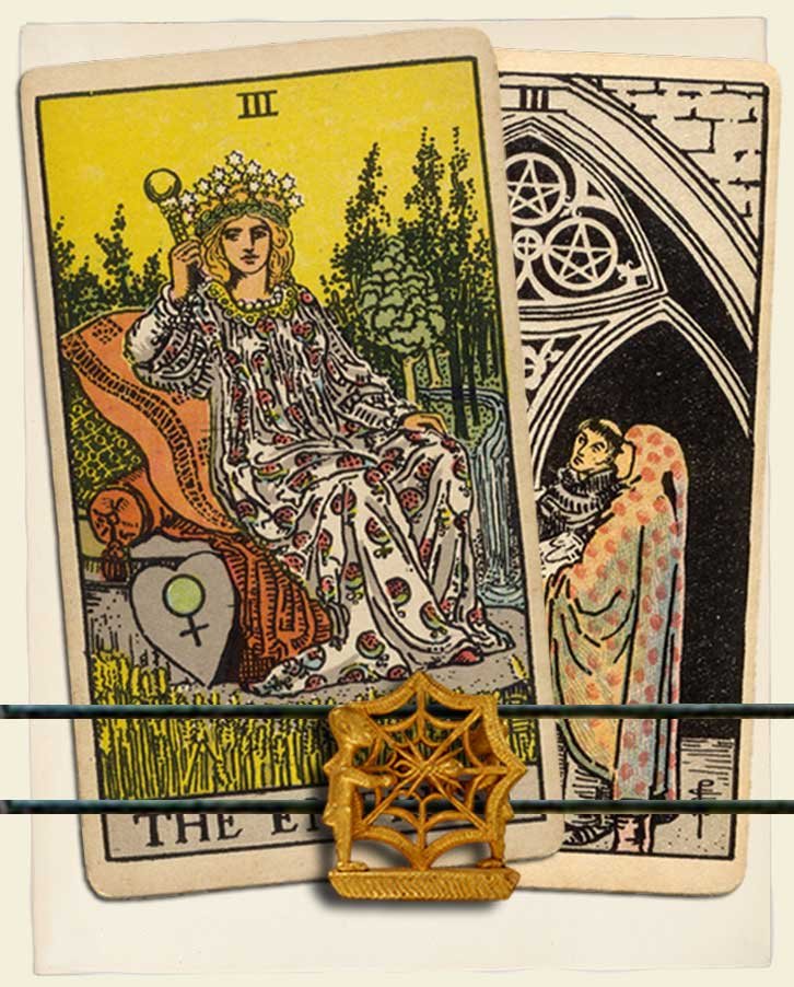 The Empress and Three of pentacles combination means that arcane tarot forces: (1) Beauty (The Empress) and (2) Shared Goals (influence of Three of pentacles) have influence on you at this moment. What’s the advice of this pair? The presence of the Empress indicates that there is something important in your life to protect, because it is valuable. This energy can be very beautiful, but it also carries a lot of responsibility. It may feel as if you are being asked to take on too much, so the presence of the Three of pentacles indicates that you need to find collaborators who share your goals for how to handle what needs protecting. You will likely benefit from forming alliances with people outside your usual circle or even outside your country or culture. Seek out new friends and colleagues who will help balance out some heavy responsibilities you may be taking on right now.