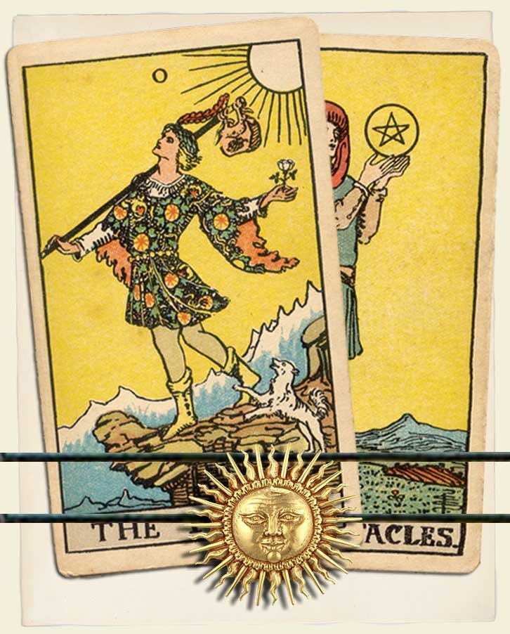 The Fool and Page of pentacles combination means that arcane tarot forces: 1) Originality and 2) Goal Oriented are steering you into another direction today. What’s the advice of this pair? The Fool represents a new beginning, often under circumstances of risk. This card indicates that you may be taking on something new with some uncertainty attached. The Page of pentacles is an energy that brings about stability and abundance. It also carries a serious side – prudence and wisdom (or at least the appearance thereof). You need to take on more than just the foolhardiness represented by The Fool to make this leap forward successfully, but it will help if you have your head in the right place.