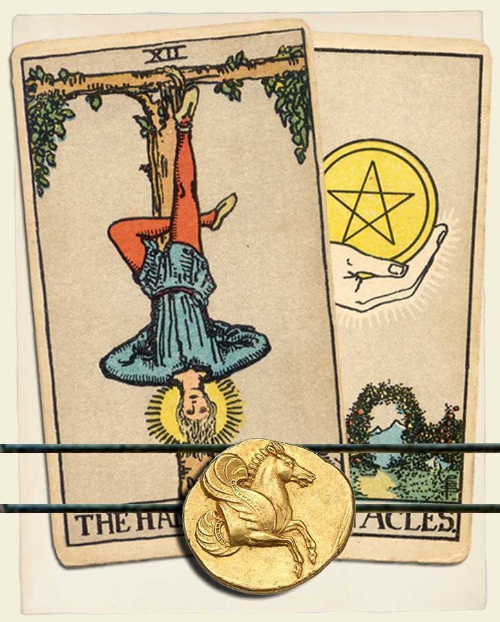 The Hanged Man and Ace of pentacles tarot combination indicates that two arcane forces: I) Pause (The Hanged Man) and II) Resources (Ace of pentacles) govern your life decisions today. What does it mean? To put it differently, it means that you have been doing most of your work the hard way when you can do your work in a much faster and more efficient way if you started to use the resources that you already have. So, think about it. What resources do you have that you could use to make your life easier? Once you take a pause and begin to think in this way, you will figure the answer to working smarter instead of harder.