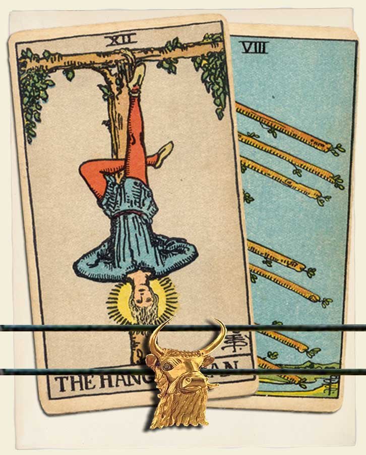 The Hanged Man and Eight of wands combination means that two tarot influences: 1) Surrender and 2) Air Travel are jointly exerting their influence on your life’s choices. In other words, it means there is forward momentum in some element of your life through an upcoming trip. Lean in to all that this trip and the people on it have to offer. You may be feeling dragged, but by shifting the perspective, you may begin to even enjoy this journey ahead. Unlock the chains of control you’ve been gripping to and surrender to that which the world has coming your way.