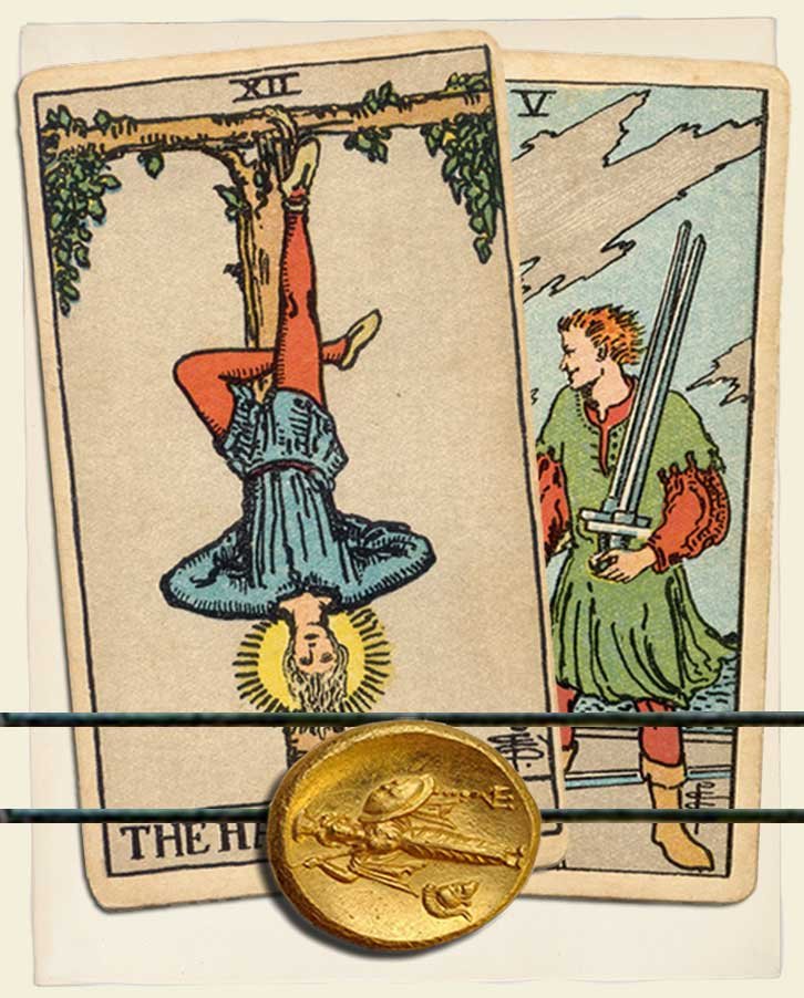 Well, I reckon this Hanged Man and Five of Swords combination is a pretty rough sign for love and relationships. The Hanged Man represents contemplation and learning something important about yourself, which can be frustrating but rewarding. But when you combine that with the Five of Swords, which indicates an unfair argument or attack going on around you, things start to look downright bleak.