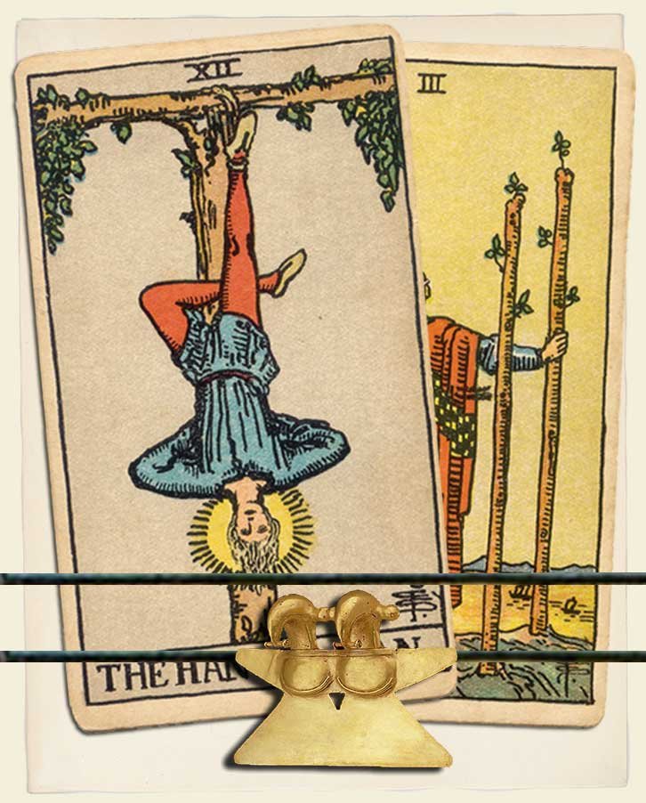The Hanged Man clarified by Three of wands gives a clearer perception about a major event in your future, which is influenced by the arcane forces of New Perspectives and Expansion. How to interpret this tarot combination in practice? New perspectives pop up your way, guiding you into a path full of possibilities. This expansion will not come without sacrifices, but you know that the way to success or joy is not always an easy one. Future shows a rapid growth coming your way: be ready to embrace it, to be blessed by it. Only those who allow new perspectives to come their way will, eventually, welcome in their lives the power of revolutionary mindsets.