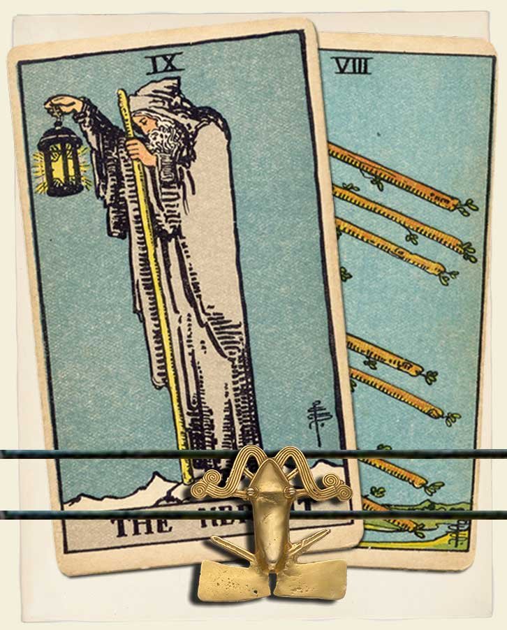 The Hermit and Eight of wands combination gives you intuition about your near future, which is influenced by the arcane tarot forces of (A) SOLITUDE and (B) MOVEMENT. What’s the advice of this pair? The Hermit represents isolation to contemplate something important in your life. This energy can be very lonely, so don’t feel obligated to stay here for too long. It also means that whatever it is you want to think about will require a lot more than just your thoughts alone. The presence of the Eight of wands indicates that there may be some people around you who are excited or even anxious for things to change in your situation. Be careful not to take on any more obligations than necessary, but do allow others their opportunity to help bring things into alignment for you.