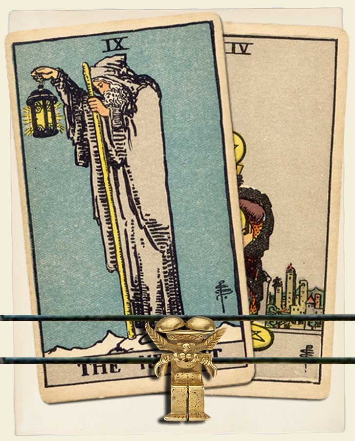 The Hermit and Four of pentacles tarot combination means that two tarot influences: (1) Withdrawal and (2) Conservatism currently guide your decisions. These cards in combination represent a force that at times can be wise, with the potential to block movement or progress. You aren’t going to progress in any area of your life unless you open your heart. The knowledge is there, do not ignore what you are being called to do.