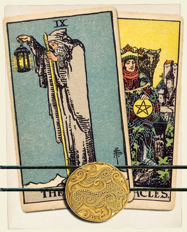 The Hermit and King of pentacles combination means that two arcane forces: 1) Withdrawal (from the side of The Hermit) and 2) Abundance (from the side of King of pentacles) have influence on you today. Those two cards are an encouraging pair, representing strength and kindness. You inspire others with your aptitude for knowledge. With the strength coming from this force, you are bound to succeed and show others just how easy it is to plan and win.