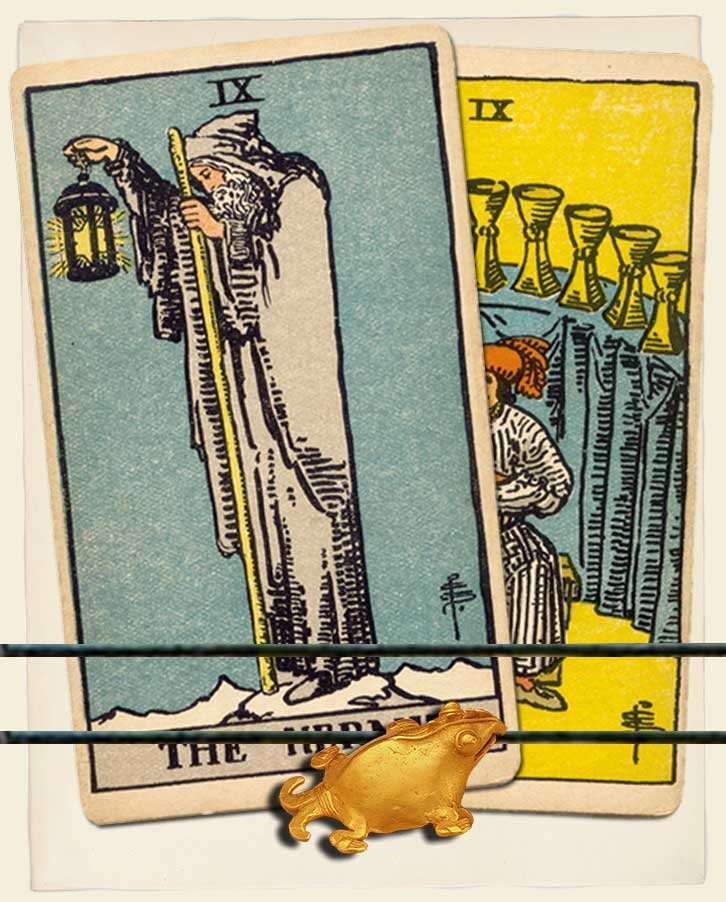 The Hermit and Nine of Cups combination is a positive sign for love and relationships. This combination suggests that you will be influenced by the arcane forces of inner guidance and contentment in your distant future.