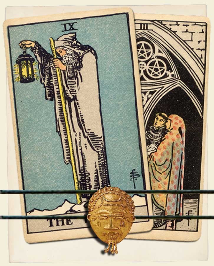 The Hermit and Three of pentacles combination indicates that two mystic forces: (1) SOUL-SEARCHING and (2) COLLABORATION (influence of Three of pentacles) have influence on you at this moment. Those cards together want to remind you that whilst it is beneficial to spend time alone, you cannot achieve everything in solitude. When you can bring your skills to the table, what happens is a meeting of minds turn into a rather satisfying group of skills ready and willing to form a show stopping team!