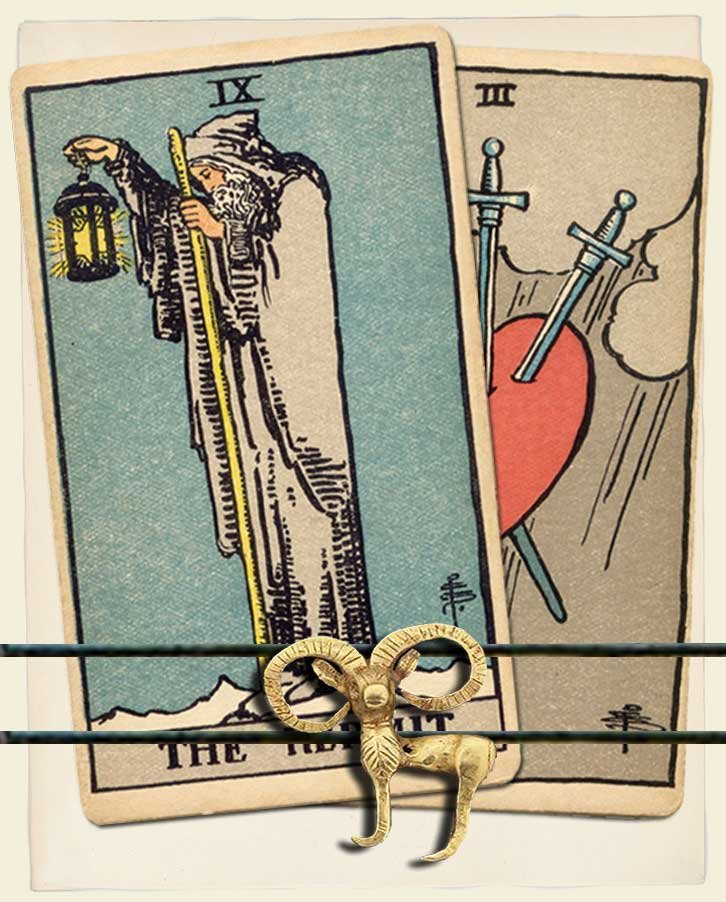 The Hermit and Three of swords tarot combination is an omen that two tarot influences: 1) Inner Guidance (from the side of The Hermit) and 2) Heartbreak (from the side of Three of swords) currently guide your decisions. Those two cards say that in your time of great loss, listen to that inner voice of strength. Stuck in sadness, it is overwhelming to think about anything other than isolating grief. Hard as it may sound, strength can be found if you dig deep and trust your intuitive.