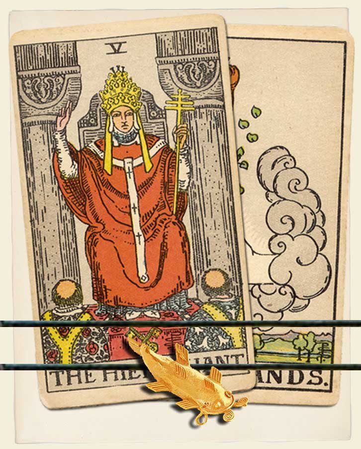 The Hierophant and Ace of wands together gives a glimpse into an event in your future, which will come to pass from the combined effect of (1) CONFORMITY (effect of The Hierophant) and (2) CREATIVE SPARK (effect of Ace of wands). This pair is for all of those that ever tried to swim the English Channel in a strait jacket. Believe it or not, it can be done. You just have to want it enough. You must kneel now at the foot of your teacher as he or she shows you how to create a powerful new direction for your life. For those who value subservience, this transition will be easy. For others, well… not so easy. Still, if you feel the need for a powerful change, it could be worth it.