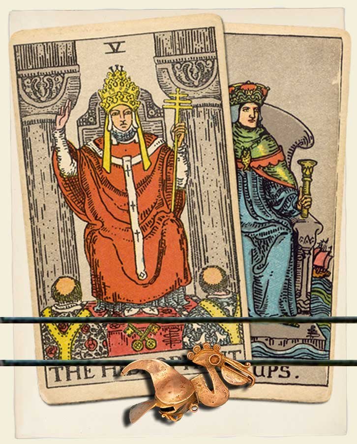 The Hierophant and King of cups tarot combination indicates that two forces: (1) religious beliefs and (2) compassionate (influence of King of cups) govern your life decisions today. In other words, it means that some strongly held beliefs will be guiding you through what others see as a mine field but you actually feel very confident about. This may be an ethical or political situation that drives some strong emotions, but you already know the direction you will go in. Be compassionate to those around you, those closest to you may think you are struggling and want to help but get in the way instead.