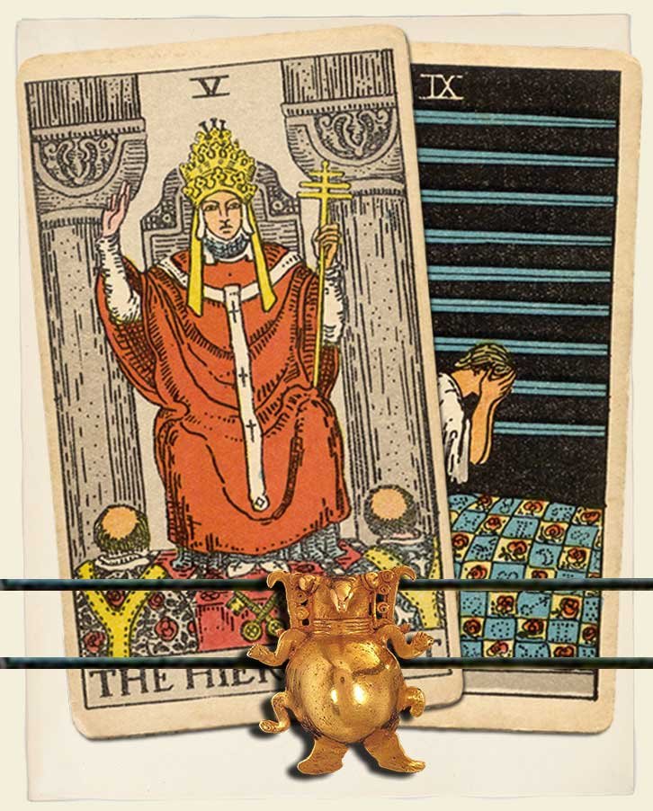 The Hierophant clarified by Nine of swords means that two forces: 1) Conformity and 2) Breaking Point are affecting you today. Tensions are running high. Proceed with caution. You may be taking on a role that leaves you feeling restrained. If you feel on edge, you should look at your environment. While some structure is helpful, holding yourself back in order to fit the standards is not. Today your true colors will show.