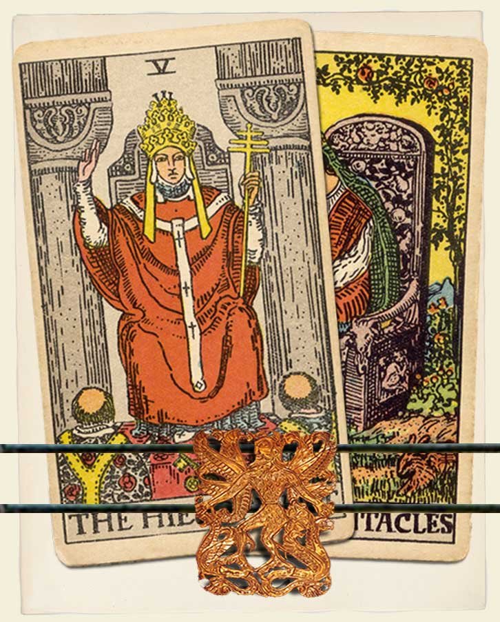The Hierophant and Queen of pentacles combination gives a glimpse into an outcome in your future, which is influenced by the tarot forces of (I) TRADITION (from The Hierophant) and (II) PROVIDING FINANCIALLY (from Queen of pentacles). In other words, it means a matriarch is willing to support you in some way, most likely financially. This may be an ancestor, a boss, or a wiser and more experienced friend. Their support may come in the form of encouragement, advice, social connections, or money. There will be strings attached when you’re dealing with the reputation of another, so respect the conditions that come along with this if you want it to persist.