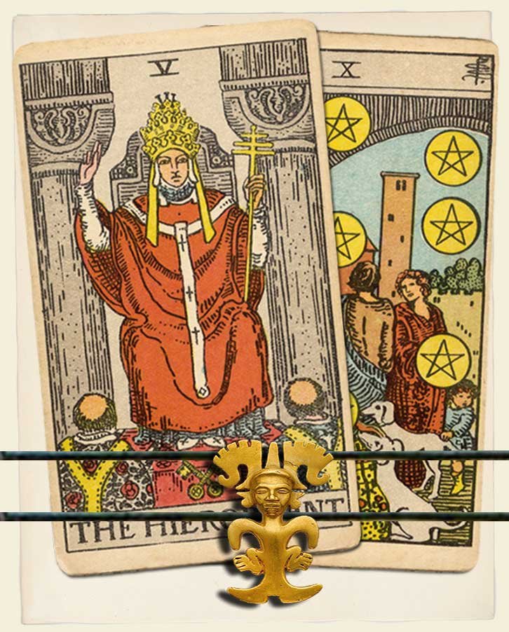 The Hierophant and Ten of pentacles tarot combination provides an insight into your medium-term future, which is influenced by the tarot forces of (I) Institutions (from The Hierophant) and (II) Ancestry. What’s the advice of this pair? The Hierophant represents a source of moral authority that you can turn to in difficult times. This card indicates that there may be something or someone in your life who has taken on a role as protector or guardian. It may be time for you to look to them for guidance and support. The Ten of pentacles represents returning home after having left behind some heavy baggage. You are leaving situations where things weren’t right but now have the potential to become so under new management. Take advantage of this energy to set up shop somewhere where things are more stable, even if it means leaving some old friends behind.