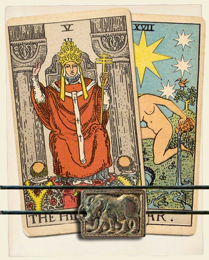 The Hierophant and The Star combo gives a glimpse into an outcome in your future. It will come to pass from the combined effect of (A) RELIGIOUS BELIEFS (effect of The Hierophant) and (B) RENEWAL (effect of The Star). To put it differently, it indicates that you will soon find new freedom. Still, it won’t be easy: The facade of a cherished belief will crumble before your eyes. It’ll be scary, sure—but once the walls have well and truly fallen, a whole world will be for the taking once again. Have no fear.