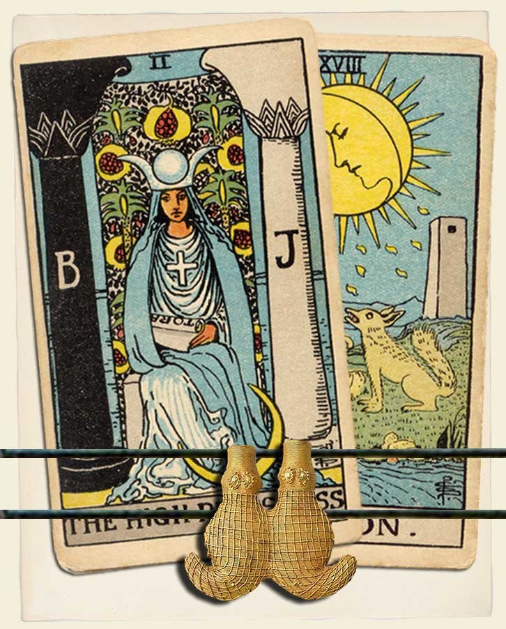 The High Priestess and The Moon tarot combination means that two mystic forces: A) Inner Voice (The High Priestess) and B) Intuition (influence of The Moon) have influence on you at this moment. With the highly intuitive High Priestess and similarly intuitive Moon, these cards indicate a time of deep self-reflection and gaining inner knowledge by letting go of some of your fears and anxieties. Sometimes we are our own worst enemy, our minds clouded by fears and anxieties, hopes and desires. Take the time to reflect on your thoughts lately. You have the knowledge, but the wild influences of the moon are affecting it in a way you might not be realizing. Keep a thought journal and write down what is at the forefront and think about what might be missing.