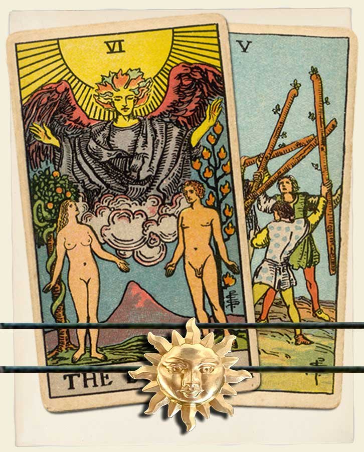 The Lovers and Five of wands combo means that mystic tarot forces: A) Harmony (The Lovers) and B) Disagreements (Five of wands) have influence on you at this moment. What’s the advice of this pair? The Lovers card represents a balanced, equal partnership where both people feel they are being heard and treated fairly. This is an energy that can create harmony in any relationship. However, sometimes we don’t always agree with each other or want to compromise, so conflict may arise. The Five of wands indicates there is some kind of dispute happening around you right now that needs to be resolved quickly before it gets out-of-control. Perhaps you need to listen more carefully to what your partner has been saying instead of just taking their word for things as gospel truth all the time like most people do when they’re angry or upset about something.