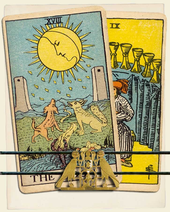 The Moon and Nine of cups combination gives an insight into your actual state and close future, which is directed by the guiding influences of (1) SUBCONSCIOUS and (2) CONTENTMENT (as clarified by Nine of cups). Those cards together want you to engage with your thoughts and feelings to discover your true potential, without the bias of others. You soak up the attention of so many people, but what about what you think of yourself? Don’t get caught up in the inflation of Ego. Enlighten your imperfections.