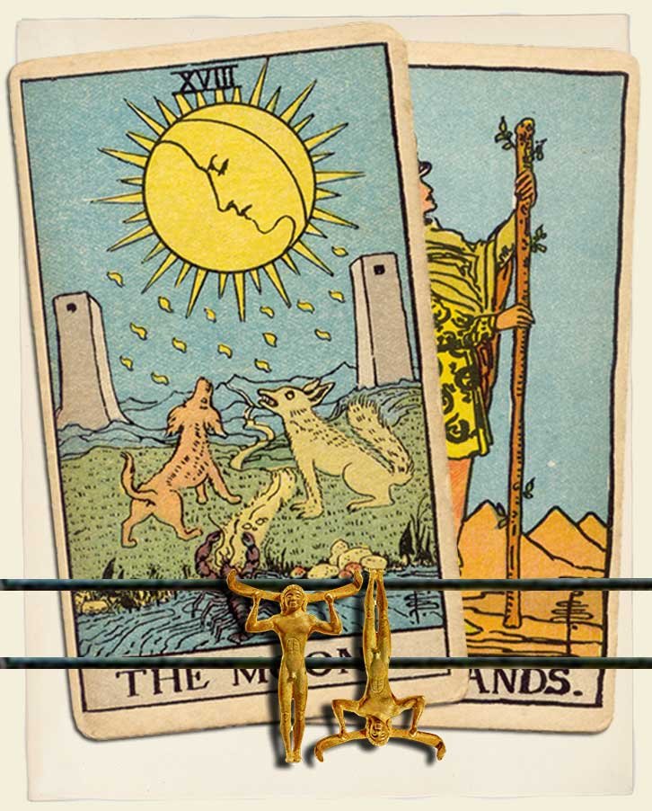 The Moon and Page of wands together indicates that arcane tarot forces: 1) Confusion and 2) Cheerfulness have influence on you today. What’s the advice of this pair? The Moon represents emotions being processed, so they can be taken to heart. This card is a reminder not to get bogged down in your feelings too much. It also means there may be some confusion around what to do about something emotionally difficult in your life. The Page of wands represents curiosity and an adventurous spirit that lead us into unknown territory. This energy often carries risk, though, because it can carry recklessness or even foolishness with it. Be sure to exercise caution as you explore new emotional territory.